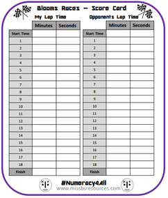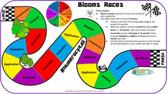 There are two different versions of Blooms Races, in both versions the teachers or students have to create a set of cards to be able to play the game. Students move their counter around the board using the wheel to indicate how many squares they move forward or back. Every time a student answer a question correctly they get a time bonus or speed boost, this time gets subtracted from the starting lap time. Every time a student answer a question incorrectly they get a time lapse, this amount gets added to the starting lap time. Their lap times can be recorded on the sheet opposite. The student who has the shortest lap time wins.